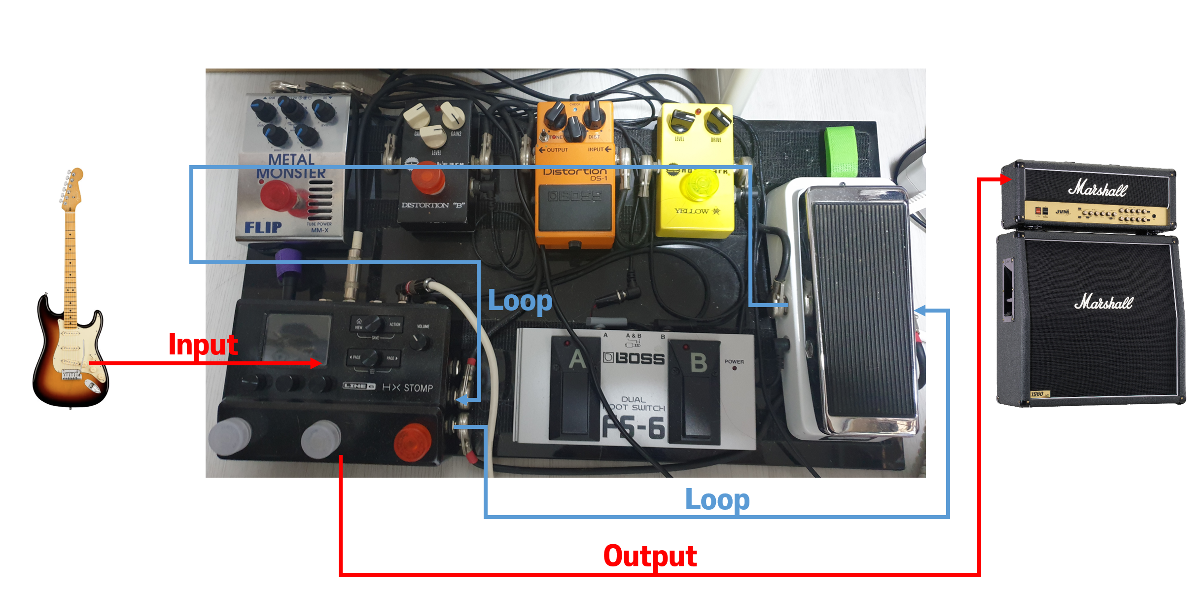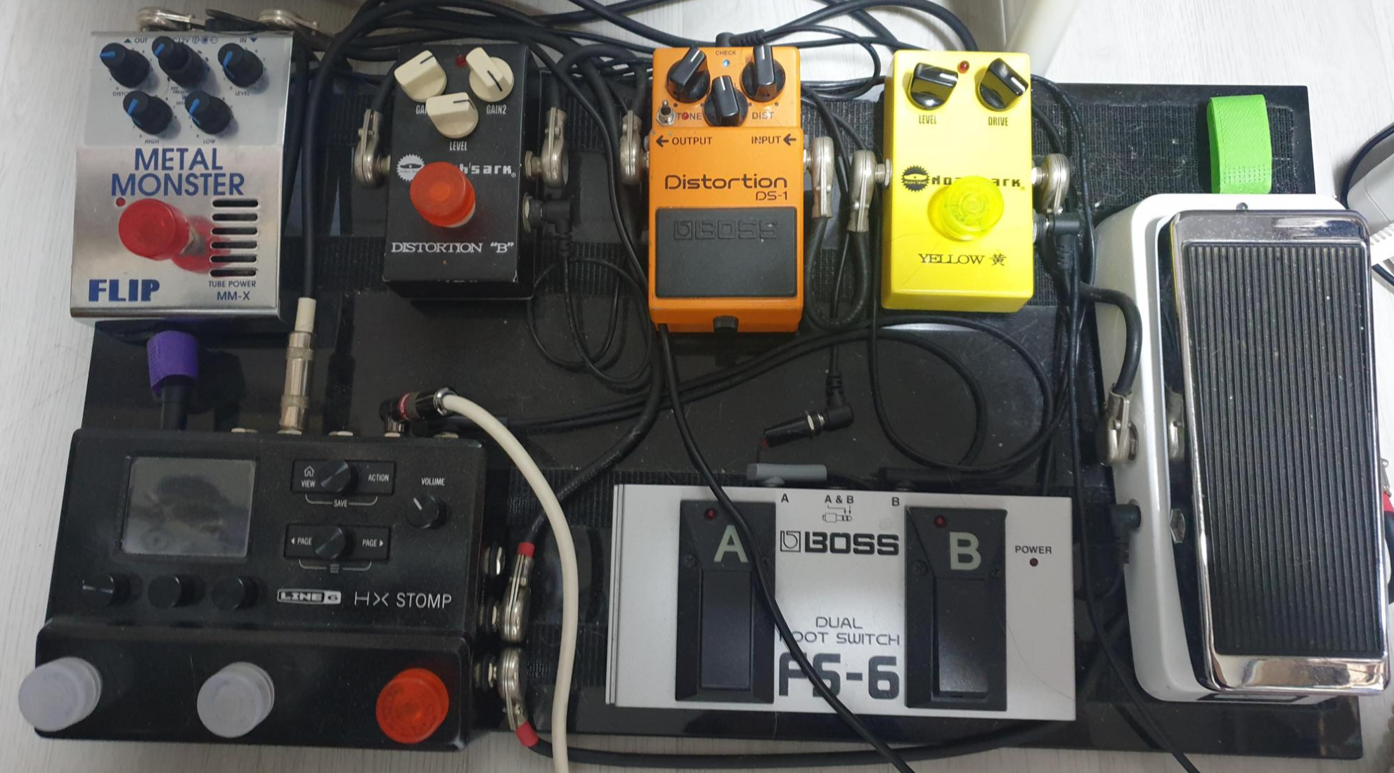 간략히 설명하면 HX Stomp 를 메인으로 나머지 이펙터를 HX 스톰프의 루프로 넣었다. 이렇게 되면 HX 스톰프 내에서 이펙터들을 전체 제어가 가능하고, 와우와 드라이브 이펙터들을 한방에 켜거나 끄는 것이 가능하다. 그리고 Boss FS-6 는 HX 스톰프의 추가 페달로 사용하고 있다. 다만, 이후 익스프레션 페달이 필요하면 교체를 할까 고민 중이다. 있다.