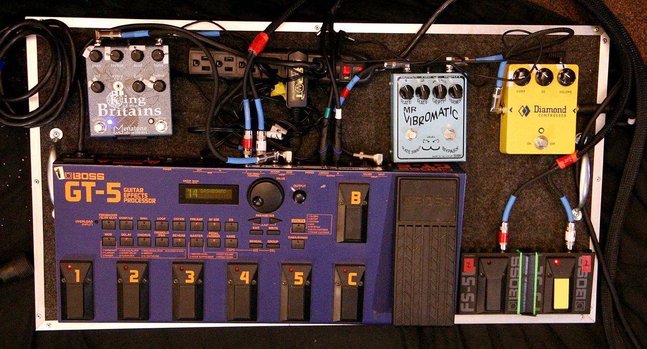 우선 첫 번째는 멀티이펙터가 가장 보드 내 가장 뒷 단에 위치하는 전형적인 구조다. 꾹꾹이들이 전방에 배치되고, 초반 필터, 다이내믹, 드라이브 류들을 꾹꾹이가 전담한다. 이어지는 멀티이펙터 내의 드라이브류나 모듈레이션, 딜레이, 리버브 등의 공간계, 후반 필터나 다이내믹 등을 멀티이펙터가 전담하는 형태라고 보면 된다.