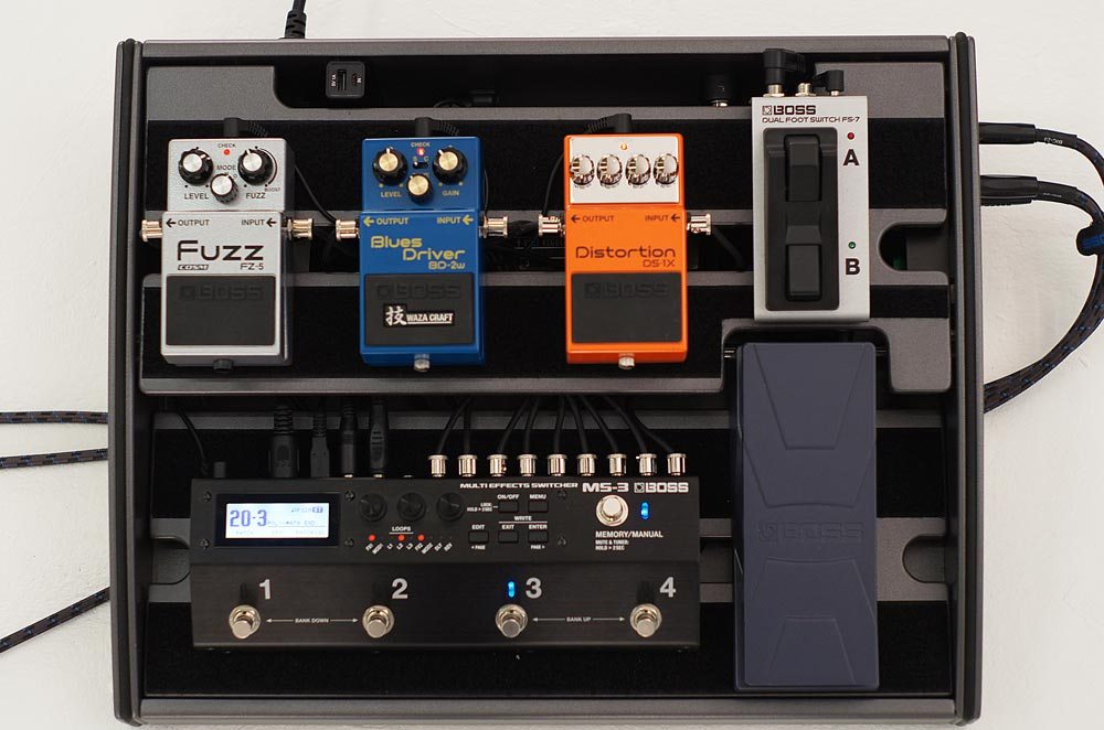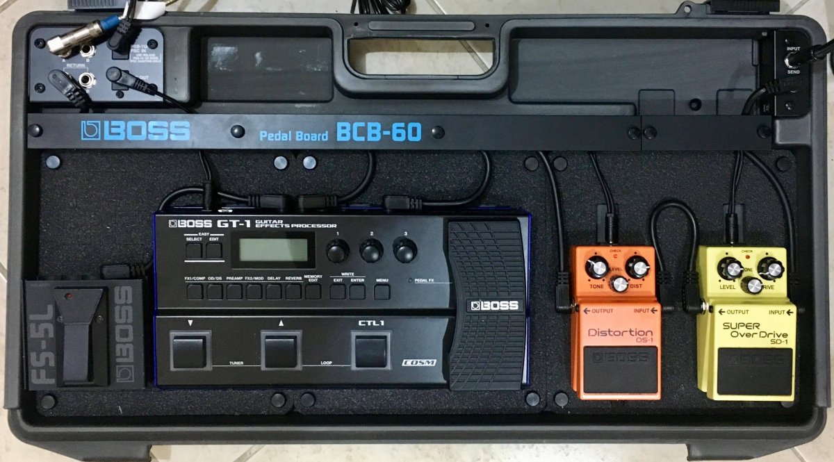 우선 첫 번째는 멀티이펙터가 가장 보드 내 가장 뒷 단에 위치하는 전형적인 구조다. 꾹꾹이들이 전방에 배치되고, 초반 필터, 다이내믹, 드라이브 류들을 꾹꾹이가 전담한다. 이어지는 멀티이펙터 내의 드라이브류나 모듈레이션, 딜레이, 리버브 등의 공간계, 후반 필터나 다이내믹 등을 멀티이펙터가 전담하는 형태라고 보면 된다.