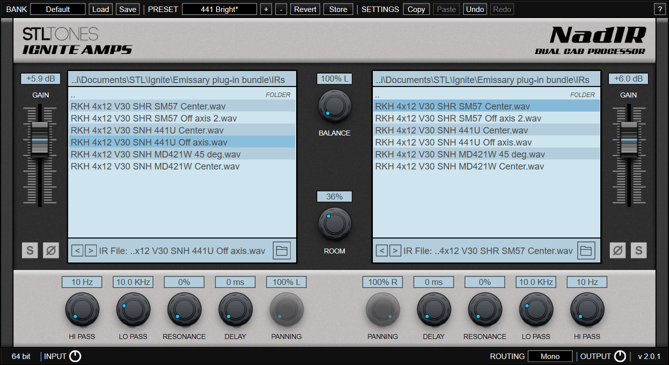 Emissary는 STLTones 사에서 무료로 제공하고 있는 이그나이트 앰프 시뮬레이터다. 클린과 리드, 두 채널을 지원하고 컨트롤 노브도 다양하게 제공하고 있다. 특히 리드 채널의 경우, 높은 게인량을 보여주고 있어서 특별히 부스터가 없어도 어지간한 장르는 대부분 커버가 가능하다. 물론 앞단의 부스터까지 포함하면 더욱 살벌하게 활용할 수 있다.