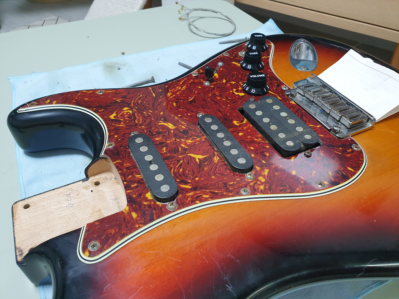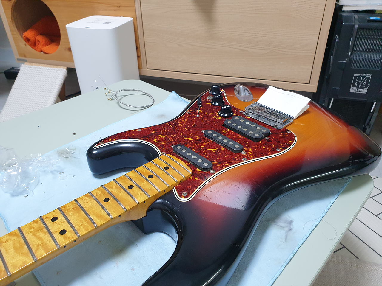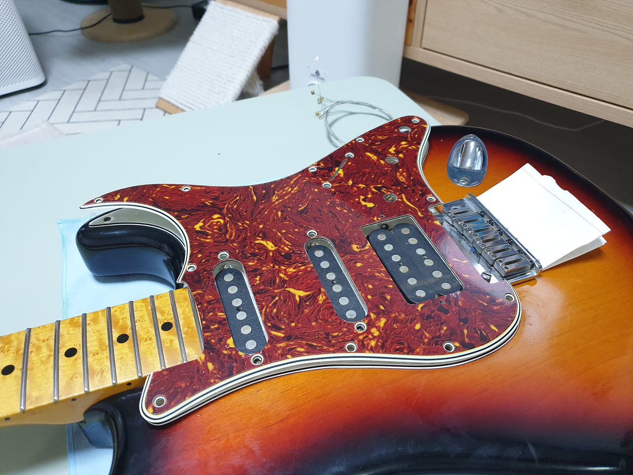 잊고 있었다. 굉장히 귀찮은 작업이었다. 픽가드를 교체한다는 것은 거의 모든 하드웨어를 픽가드에서 떼어 내야 한다는 것. 이 걸 잊고 있었다. +a 로 넥을 분리해야 하는 것도 일이었다. 이렇게까지 빡셀지...몰랐다. 아휴~ 귀찮아. 그렇지만 이미 줄 풀고, 나사도 풀렀으니... 가는 거지 뭐~.