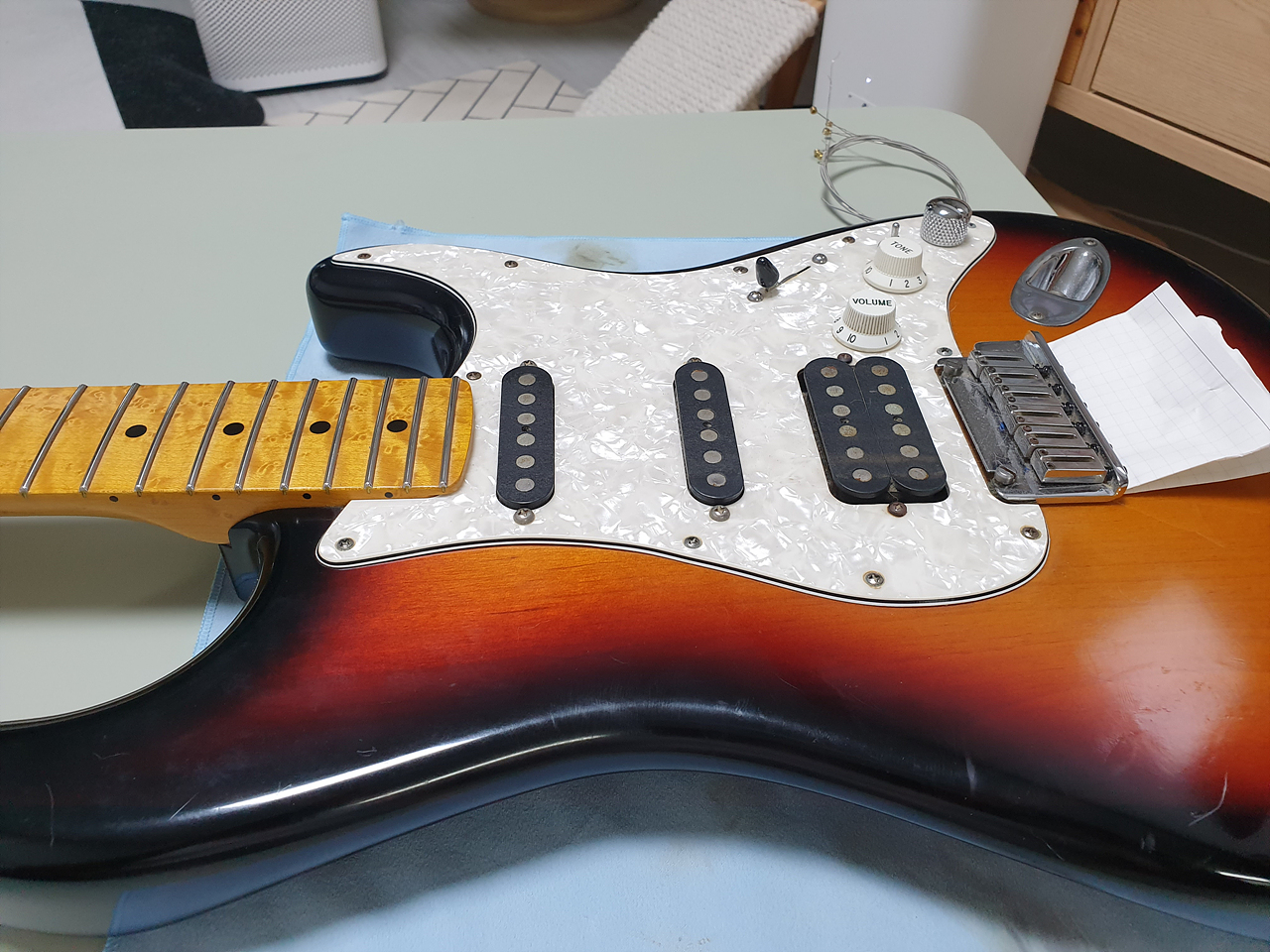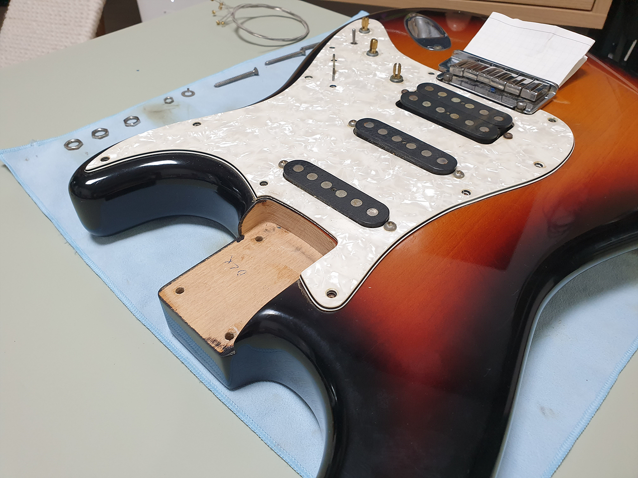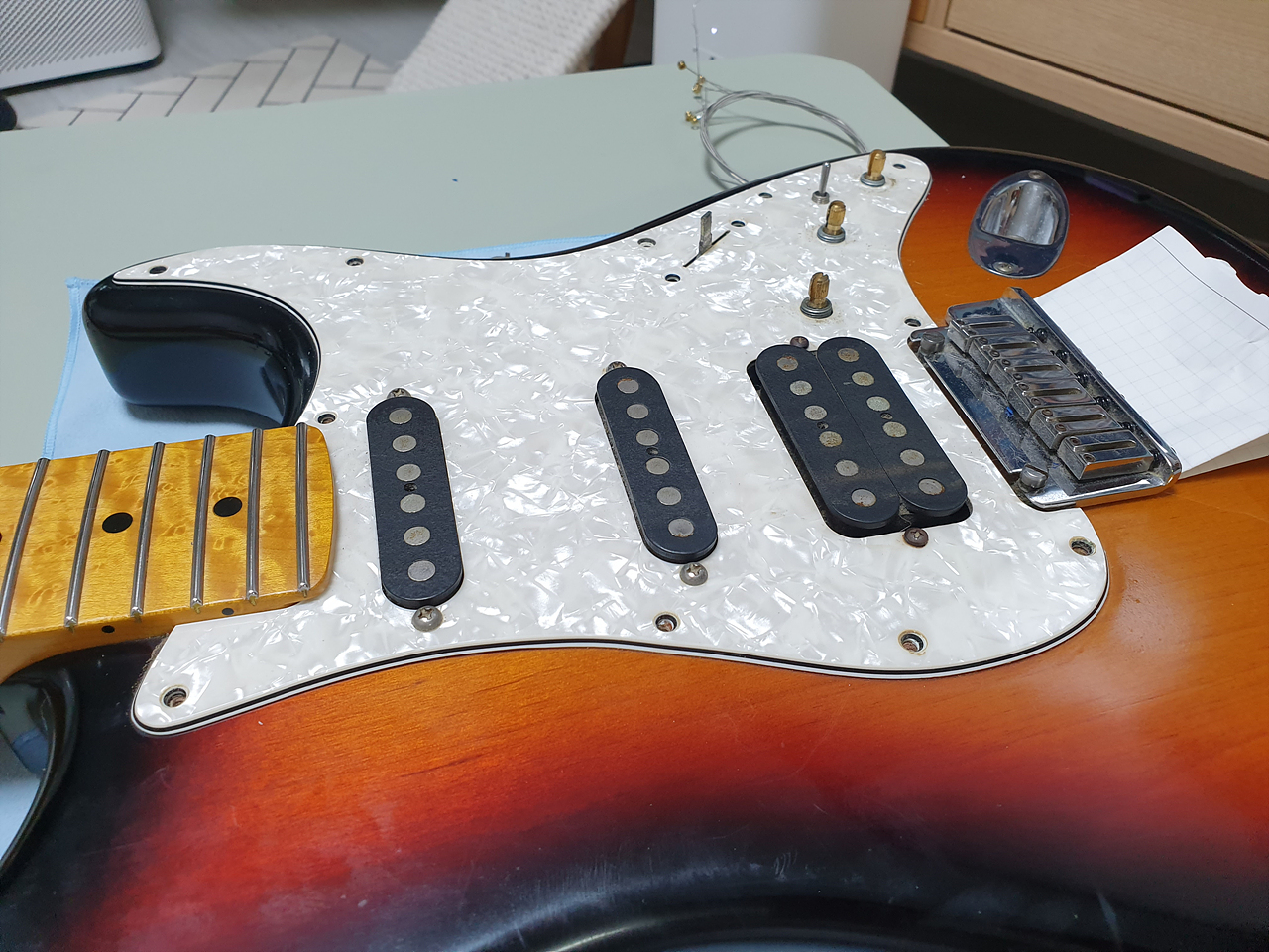 잊고 있었다. 굉장히 귀찮은 작업이었다. 픽가드를 교체한다는 것은 거의 모든 하드웨어를 픽가드에서 떼어 내야 한다는 것. 이 걸 잊고 있었다. +a 로 넥을 분리해야 하는 것도 일이었다. 이렇게까지 빡셀지...몰랐다. 아휴~ 귀찮아. 그렇지만 이미 줄 풀고, 나사도 풀렀으니... 가는 거지 뭐~.